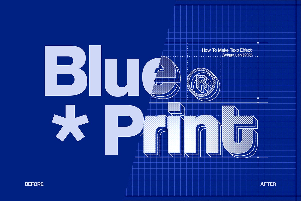 A modern take on technical drawing aesthetics, featuring bold 3D typography built from precision lines, grid alignment, and dimensional measurements. The Blueprint effect blends engineering discipline with creative structure, symbolizing how design ideas take form from concept to reality.