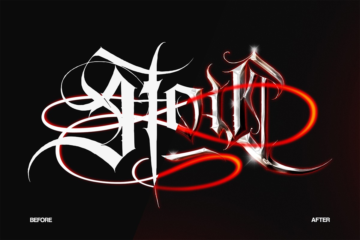 A visual evolution from a flat gothic type to a burning chrome masterpiece. The “After” demonstrates the transformation into dimensional lettering with polished surfaces, red reflections, and the visual language of heat and energy.
