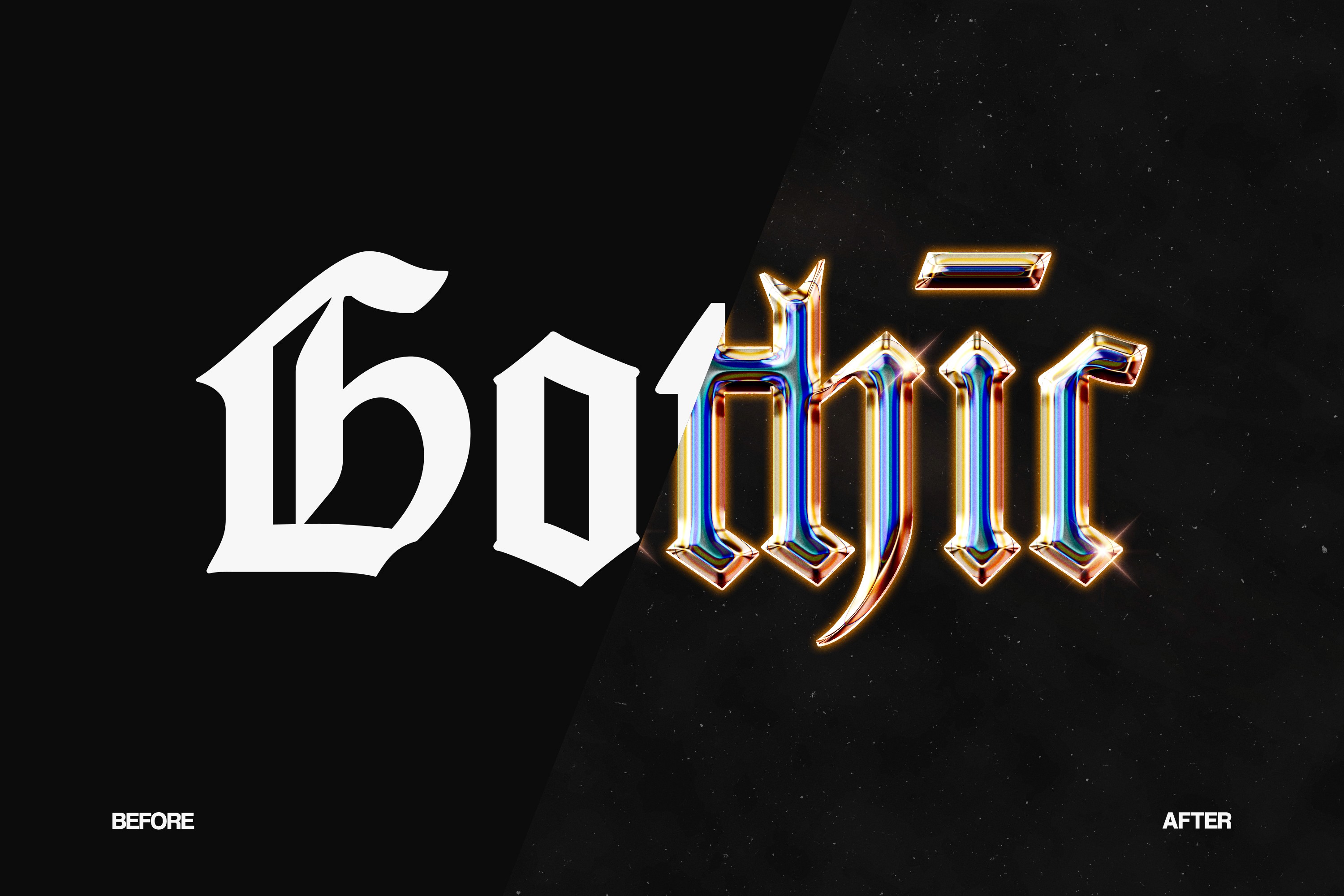 A striking transformation preview that reveals the evolution from a flat gothic font into a luxurious chrome masterpiece. The “After” version emphasizes depth, glassy reflections, and luminous edges.
