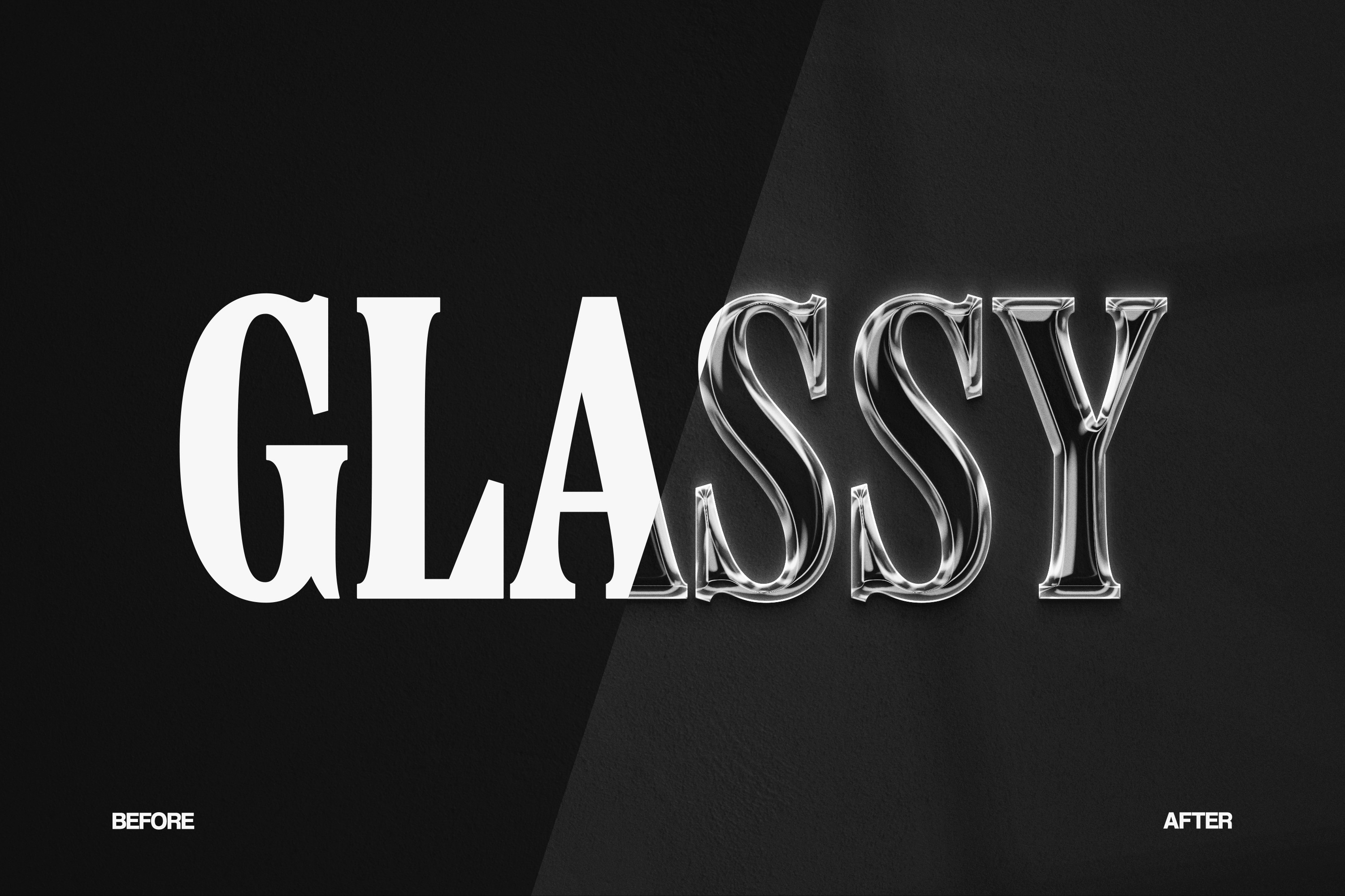 A clear transformation preview demonstrating how a simple flat serif font evolves into a polished glass chrome text effect. The “After” version showcases enhanced depth, realistic transparency, and smooth reflective contours.