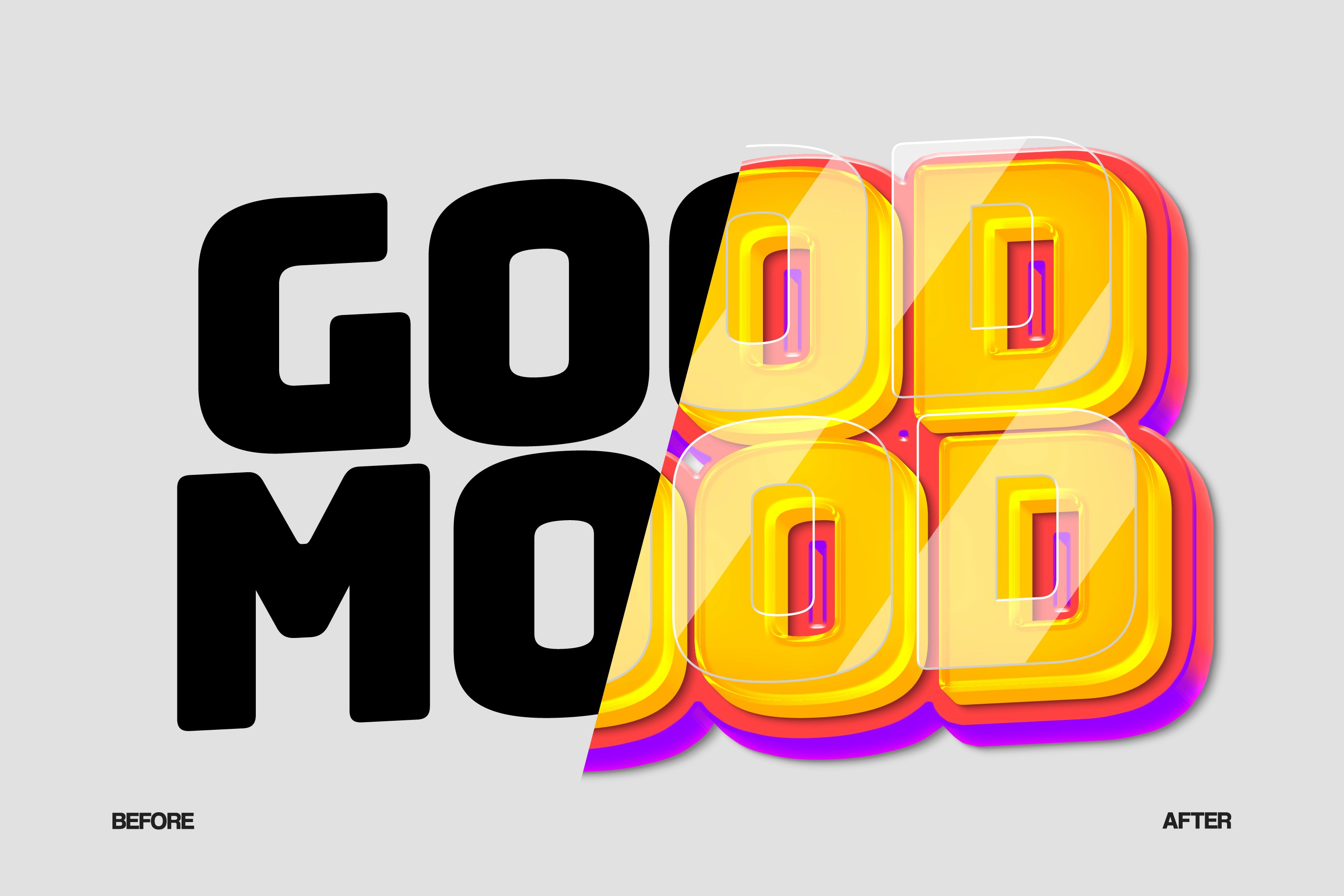 Vibrant, joyful, and full of pop energy GOOD MOOD is a celebration of color and shine. This playful 3D text effect merges layered yellow tones, translucent glass overlays, and magenta reflections to create a bold, candy-like look that instantly uplifts your design.