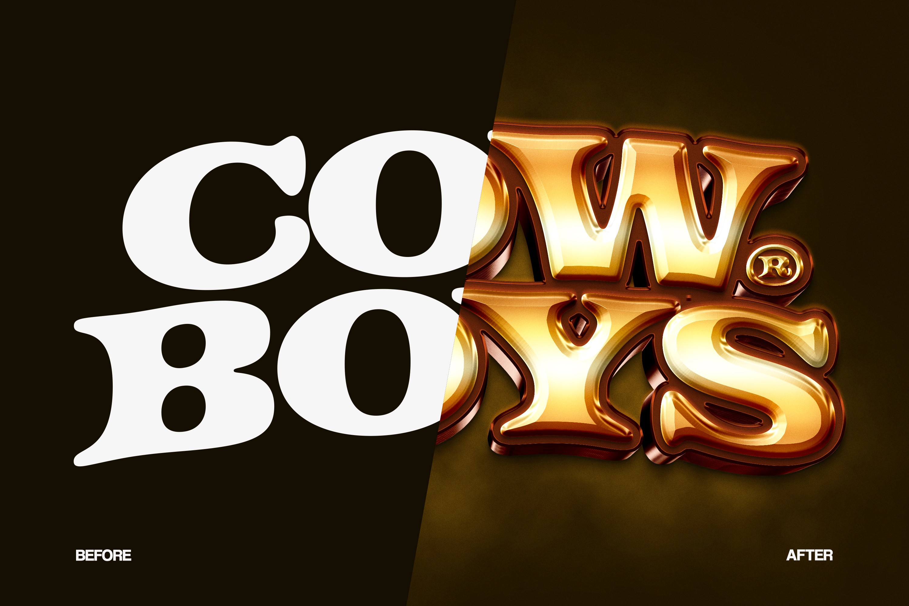 A bold western-inspired text effect featuring polished gold surfaces, warm metallic tones, and classic cowboy typography. This design blends vintage western aesthetics with a luxurious modern finish, creating a powerful and confident visual identity perfect for logos, badges, and premium branding.
