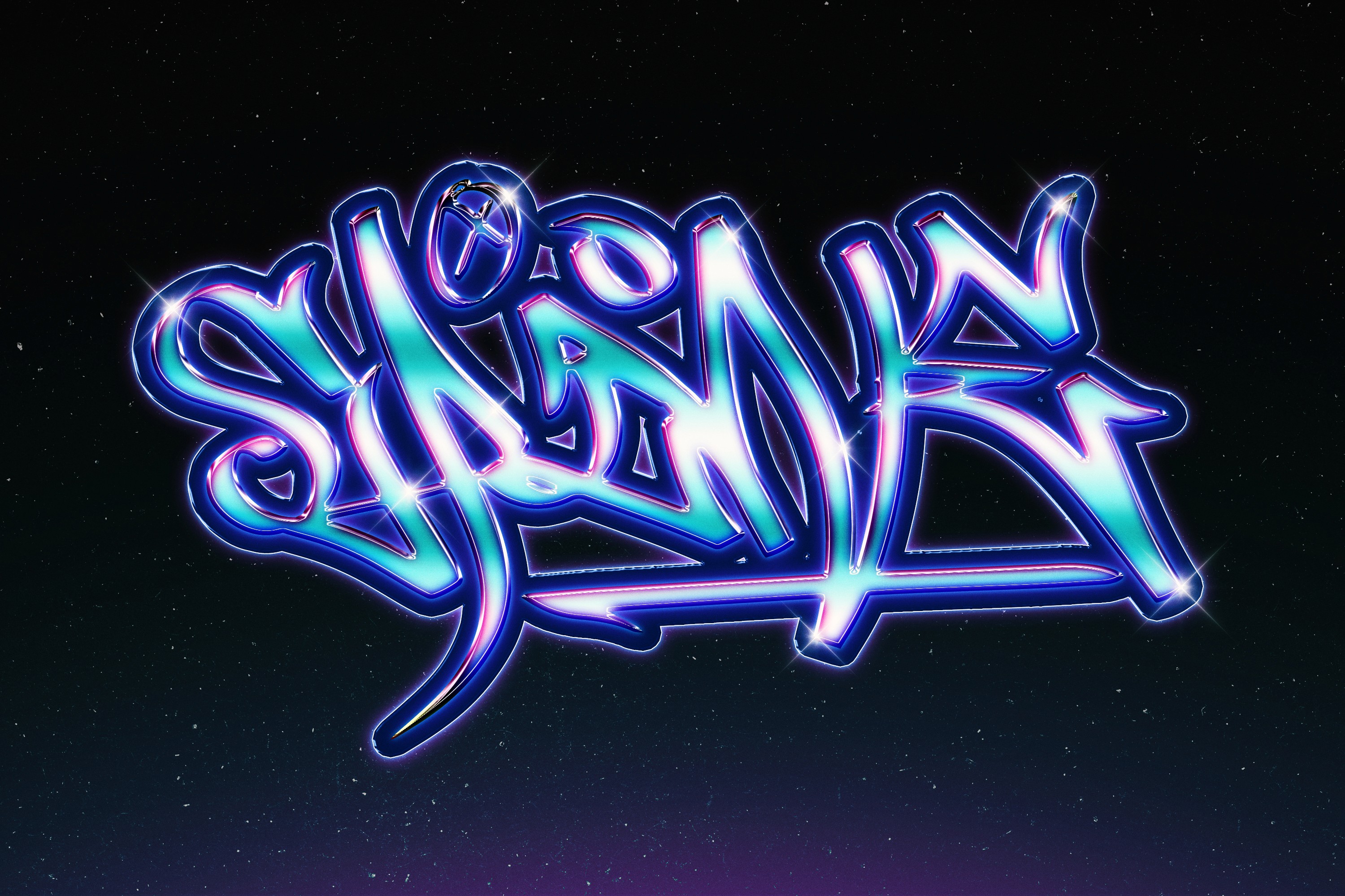 A graffiti-inspired holographic chrome lettering with bold attitude.