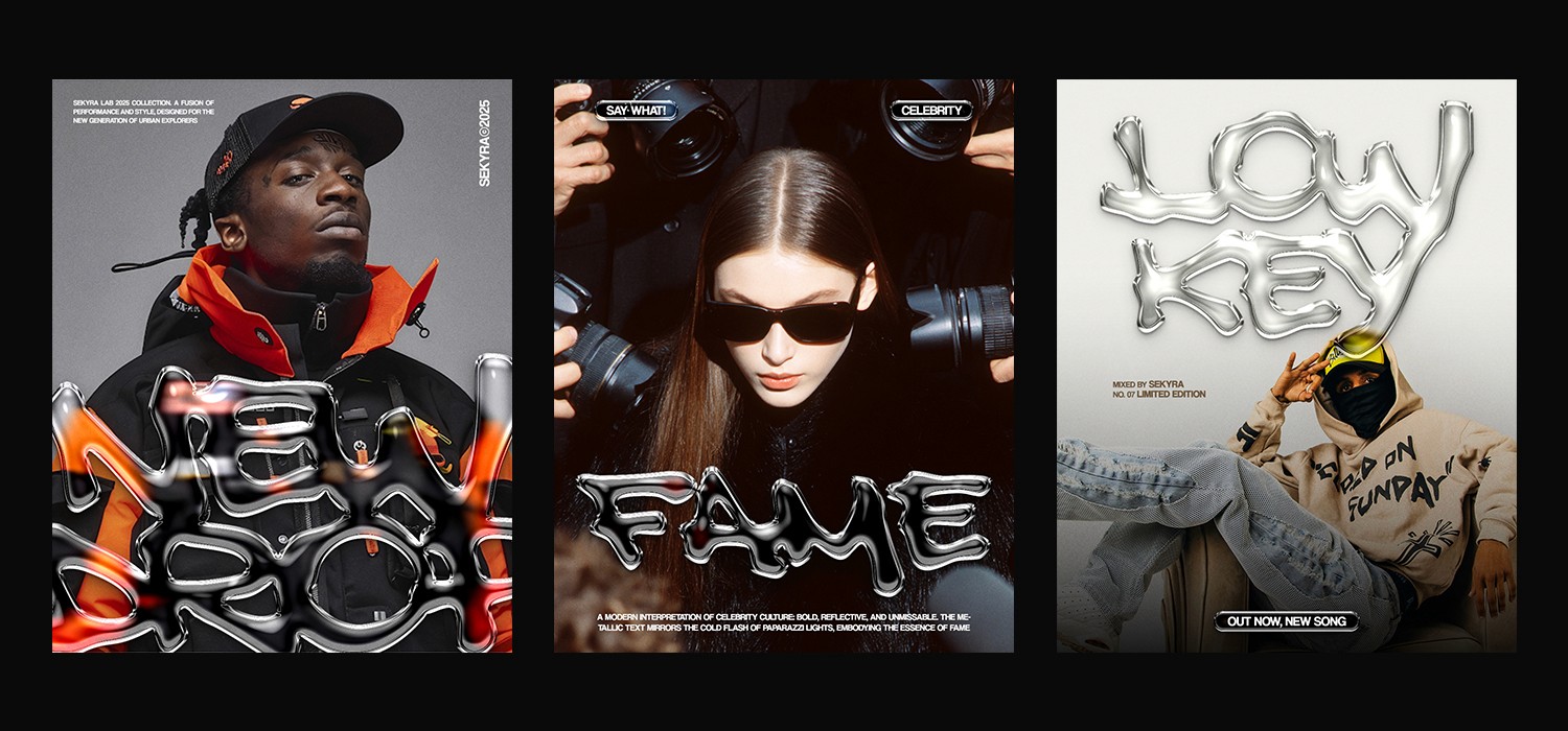 Each composition pairs chrome liquid typography with editorial portraiture from loud to low-key, reflecting both the glamour and solitude behind style and fame.