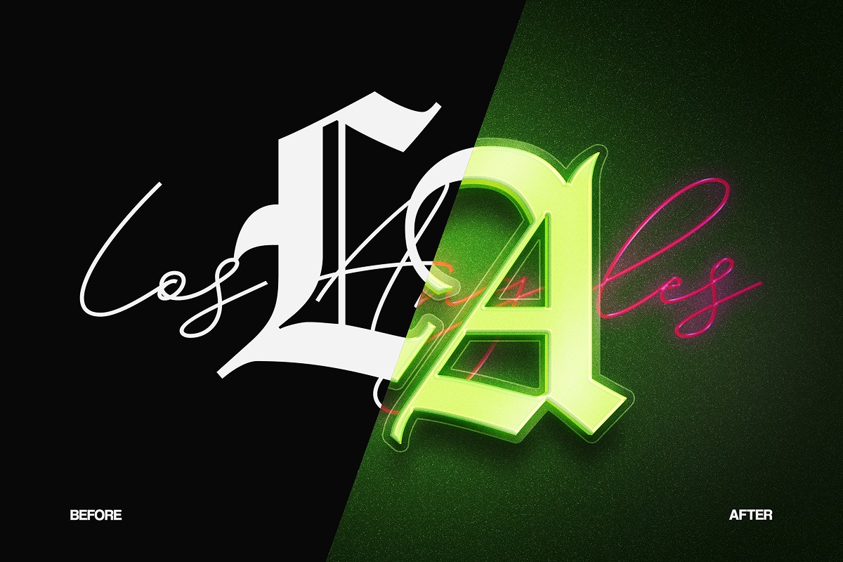 Where gothic culture meets California nightlife. LA blends sharp blackletter typography with glowing neon energy a perfect homage to Los Angeles’ urban pulse. Designed with a fluorescent green core and pink neon script, this effect bridges street heritage and modern visual flair.