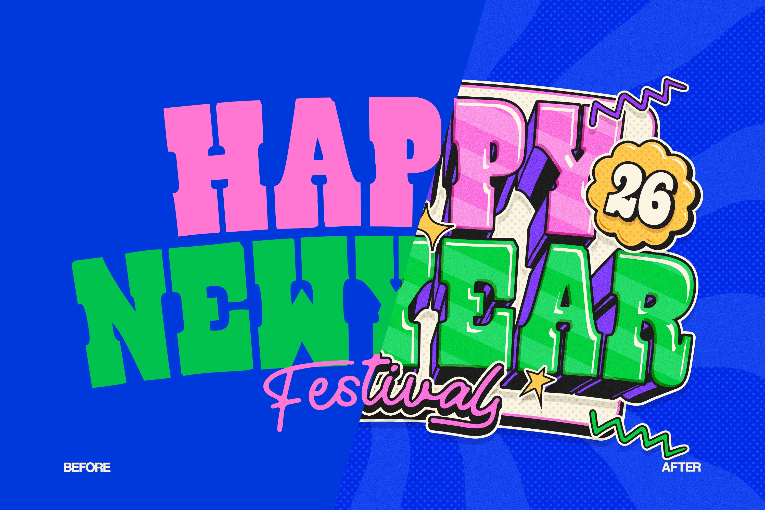 A clear visual comparison showcasing the transformation from a simple flat font into a colorful festival-style text effect. The “After” version highlights enhanced depth, bold outlines, playful shadows, and decorative elements ideal for demonstrating the power of typographic styling.