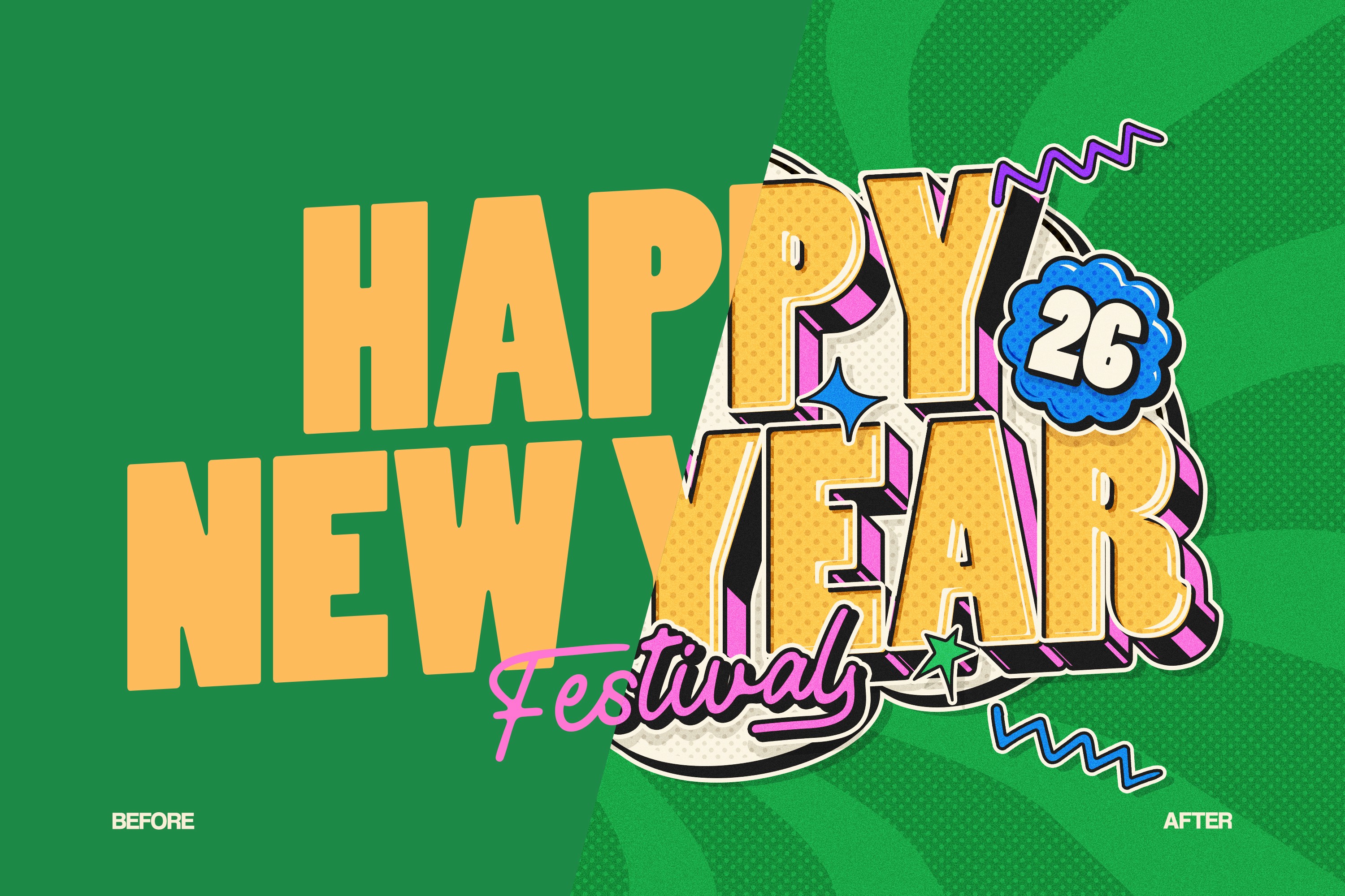 A clean transformation preview illustrating the shift from a flat, minimal font into a fully styled retro pop festival text effect. The “After” version highlights halftone textures, dimensional depth, colorful shadows, and decorative elements. ideal for showcasing visual impact and creative transformation.
